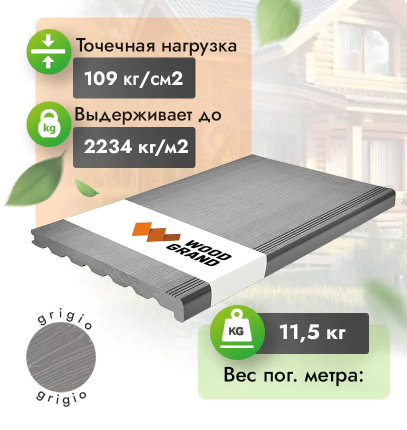 Наши ступени из ДПК выдерживают до 3318 кг/м2, влагостойкие, не требуют ухода.