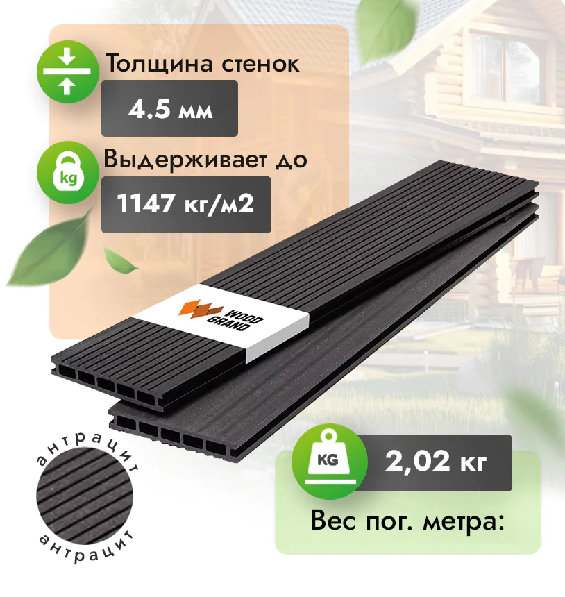 Наша террасная доска из ДПК выдерживает до 3318 кг/м2, влагостойкая, не требует ухода.